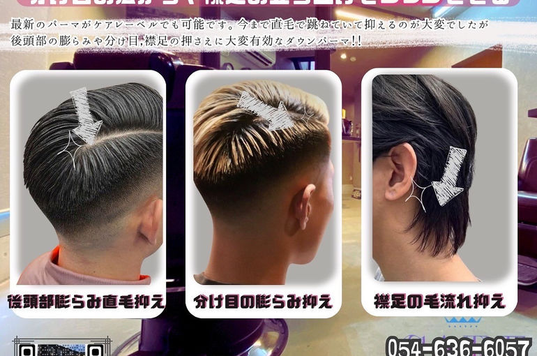 #ダウンパーマ #島田美容室 #ケアレーベル #静岡美容室 #メンズパーマ #髪質改善 #時短スタイリング#後頭部の膨らみ #分け目カバー #襟足抑える #メンズヘア