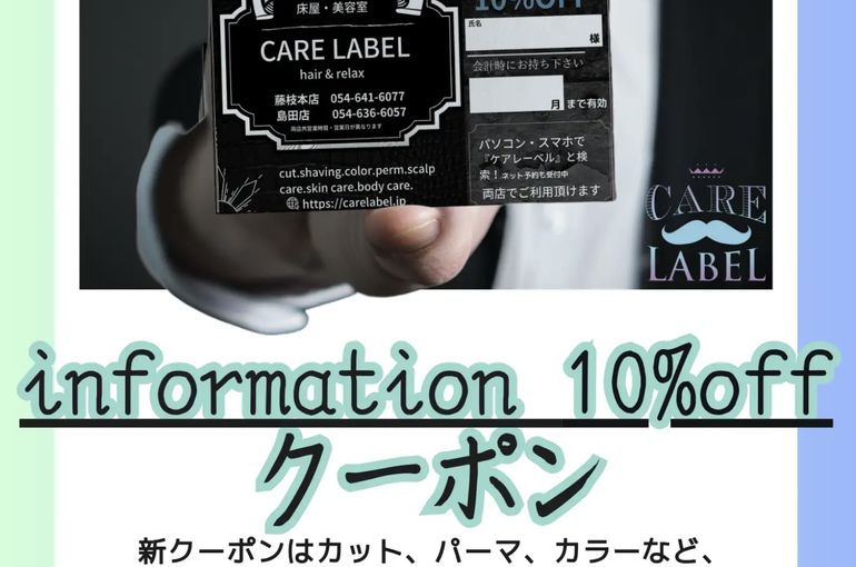 ケアレーベルではご利用されるお客様へ会員証や割引券をお渡ししています。 ケアレーベル会員証にはクライアント情報及び割引クーポンのコードキーが入っており、ご利用頂くお客様により良いサービス提供の為のヘアスタイル情報や学生割・シニア割・25日以内半額割などのクーポンコードが利用出来る様に特別な会員証をお配りしています。 それに加えて100円で1ポイント貯まり、現金として1ポイントを1円にて決済時に使えますので大変お得です。